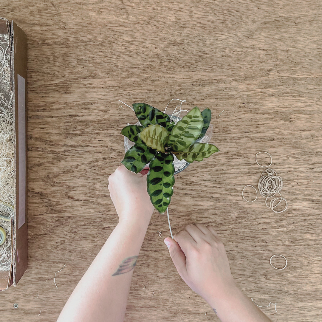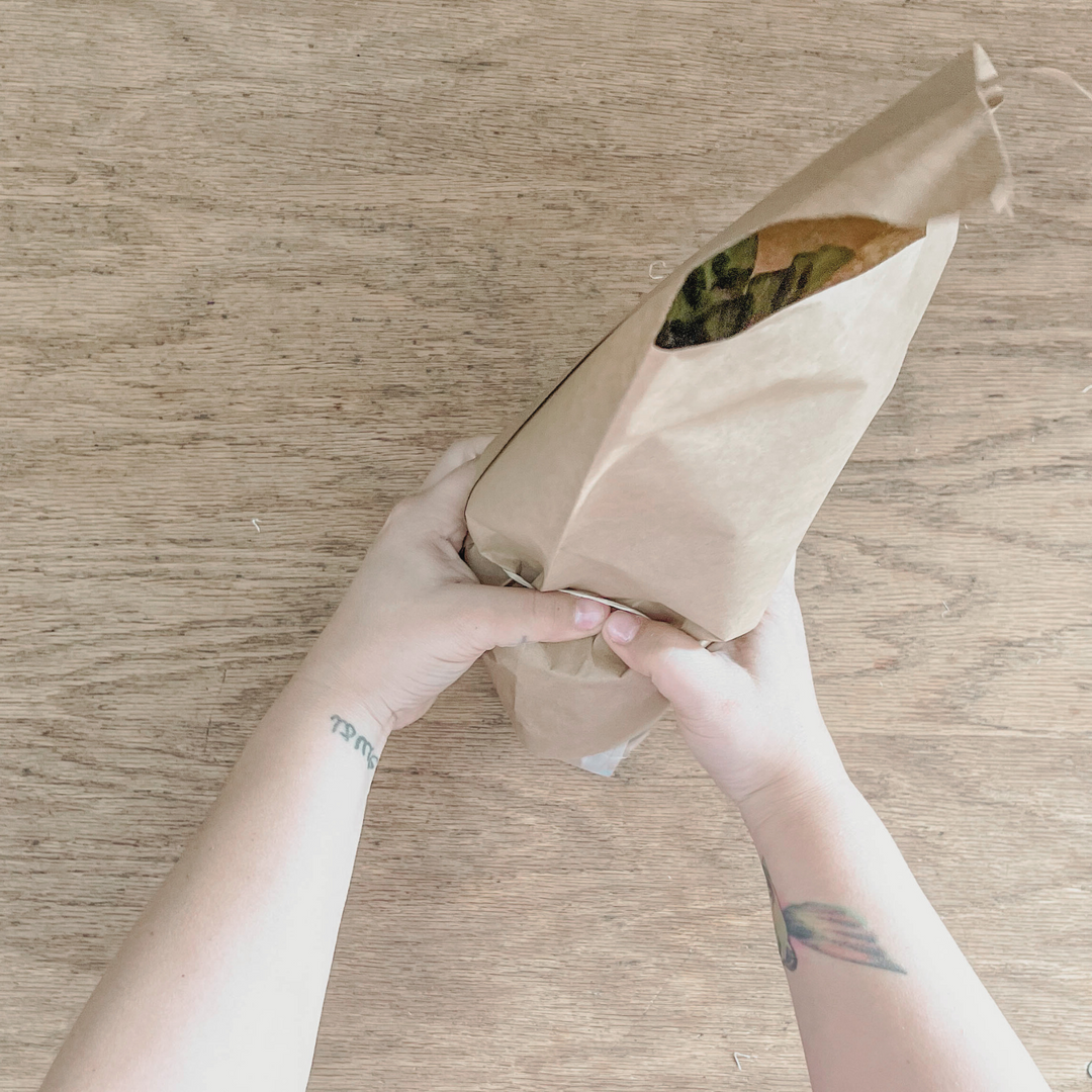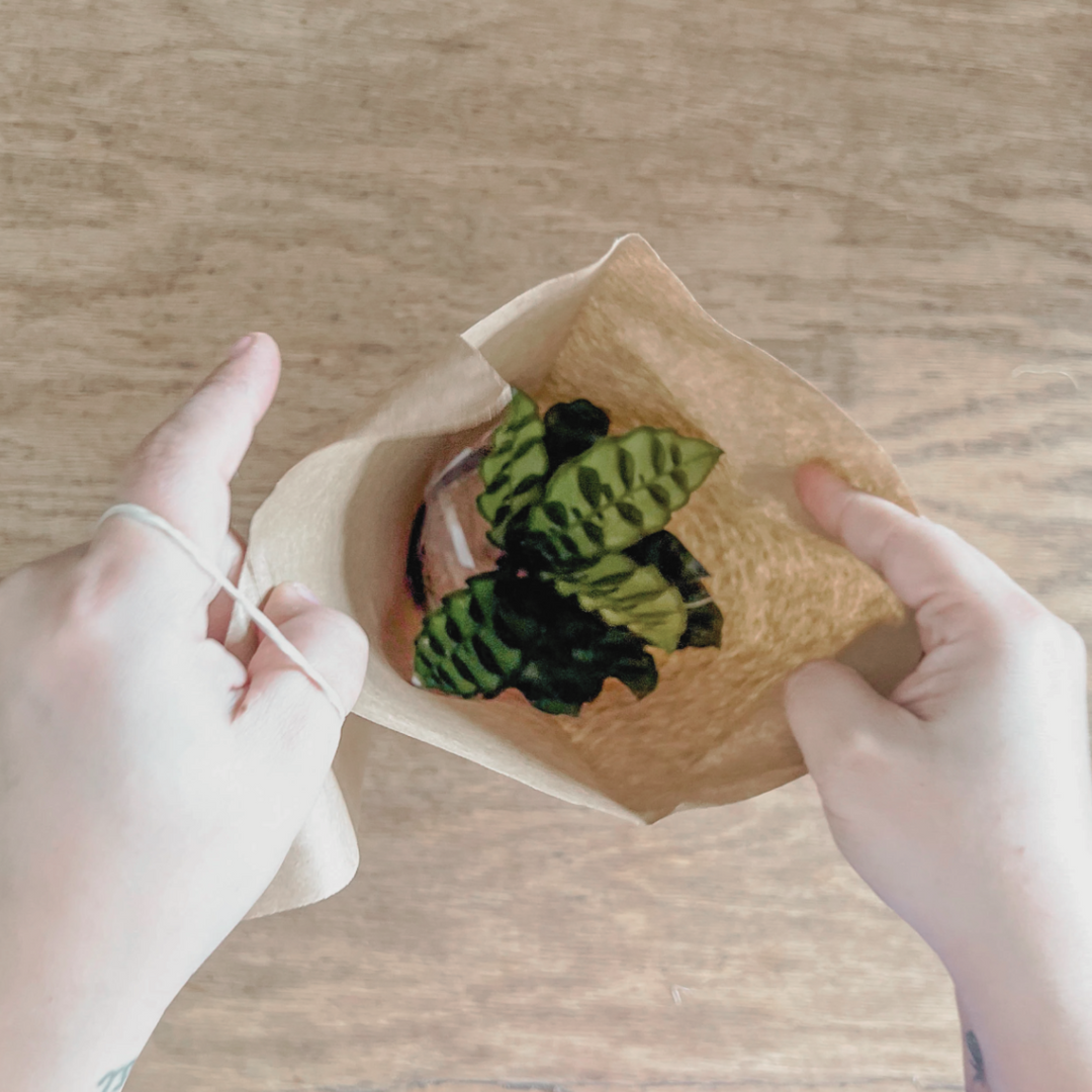 We pop the houseplant into a paper bag and seal it up tight with a rubber band.